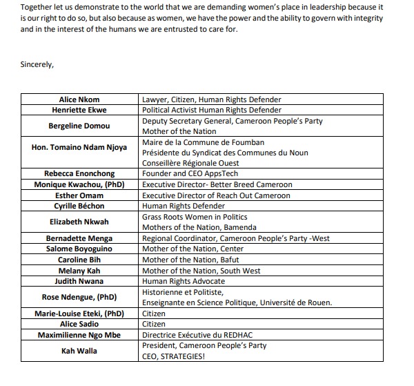 The 20 female politicians, civil society activists, and private investors including; Kah Wallah of the CPP, Patricia Tomaino Ndam Njoya mayor of Foumban, Rebecca Enonchong CEO of AppsTech, Judith Nwana human rights advocate, and several other women also urged the International Monetary Fund, IMF, to suspend aid destined for Cameroon until the first 180 billion FCFA sent to fight COVID-19 is accounted for and also that the IMF takes key measures in resolving the Anglophone crisis.