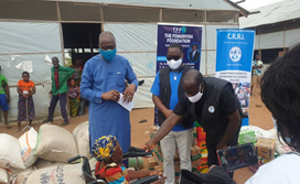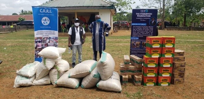 Dr. Christopher Fomunyoh of TFF and Dr. Celestine Atangcho of CRRI symbolically hand food items to refugees at Okende Settlement, Ogoja on April 6th, 2021