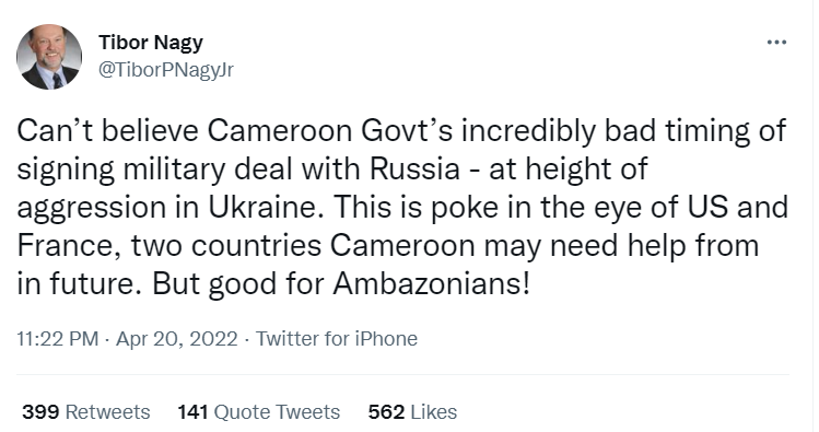 A former US deputy secretary for African affairs, Tibor Nagy said it was a poke on the faces of the US and France, “but good for Ambazonians”