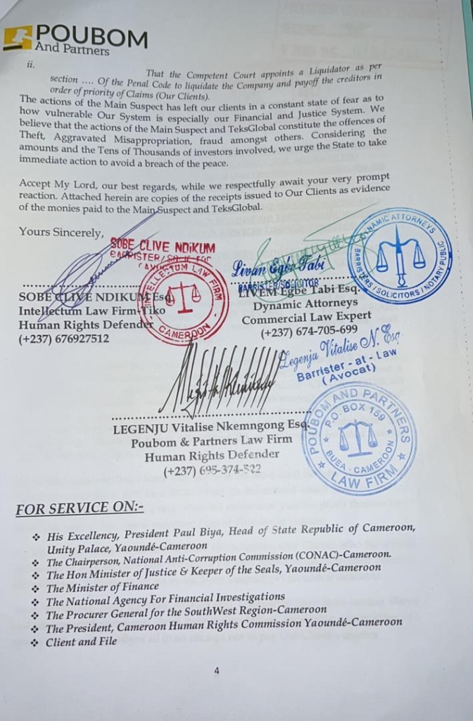 More than 274 investors have hired the services of Poubom and Partners Law firm over the nonpayment of their dues. The legal representatives have filed a complaint at the office of the State Counsel in Buea, praying for the office to open investigations and criminal proceedings against the founder, Teke Samuel Munjonji and Teksglobal, and value chain services. The complaint also begs the legal department to dissolve the said company.