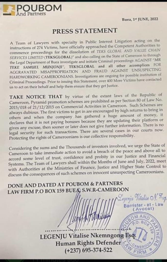 In a Press release, the law firm said they have begun proceedings for the shutdown of Teks Global and Value Chain services.