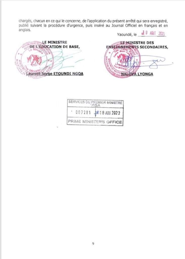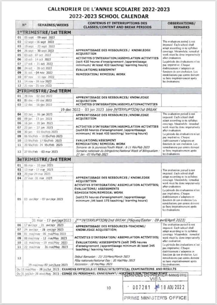 In a jointly signed press release on Friday August 19th by the Ministers of basic and secondary education, Cameroonians are informed that the first term of the academic year 2022/2023 runs from September 5th 2022 to 19 December 2022.