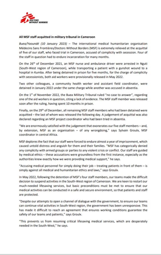 In a press release dated 10 January 2023, the organization said all charges have been dropped and all five staff who were accused of complicity with secession, facing trial in Cameroon have been released.