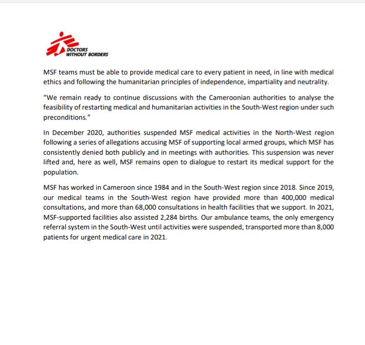 Read also: Doctors Without Borders closes bases in Kumba and Mamfe