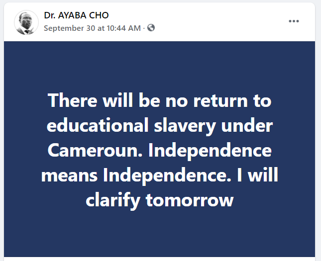 Cho Ayaba opines that, during an armed conflict situation, opinions like those calling for school resumption is premature “Most of you want to turn a war for the liberation of a people into an exercise of opinions. Opinions do not liberate. Chaos does not liberate. Policy and strategy do. Who gets up in September an overturn a four years policy, introduce a new one to take effect in weeks? Who injects such a distraction 24hrs to our day of independence? Do you then doubt when people refer to our liberation struggle as a comedy? While one arm of the confused group is calling and campaigning for a ceasefire totally ignoring the genocide, the other arm is campaigning for a return to school totally ignoring the absence of peace and justice.”