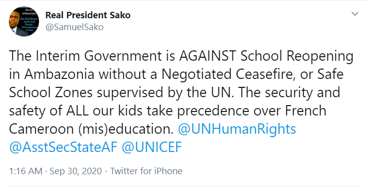 “The Interim Government is AGAINST School Reopening in Ambazonia without a Negotiated Ceasefire, or Safe School Zones supervised by the UN. The security and safety of ALL our kids take precedence over French Cameroon (mis)education. @UNHumanRights“