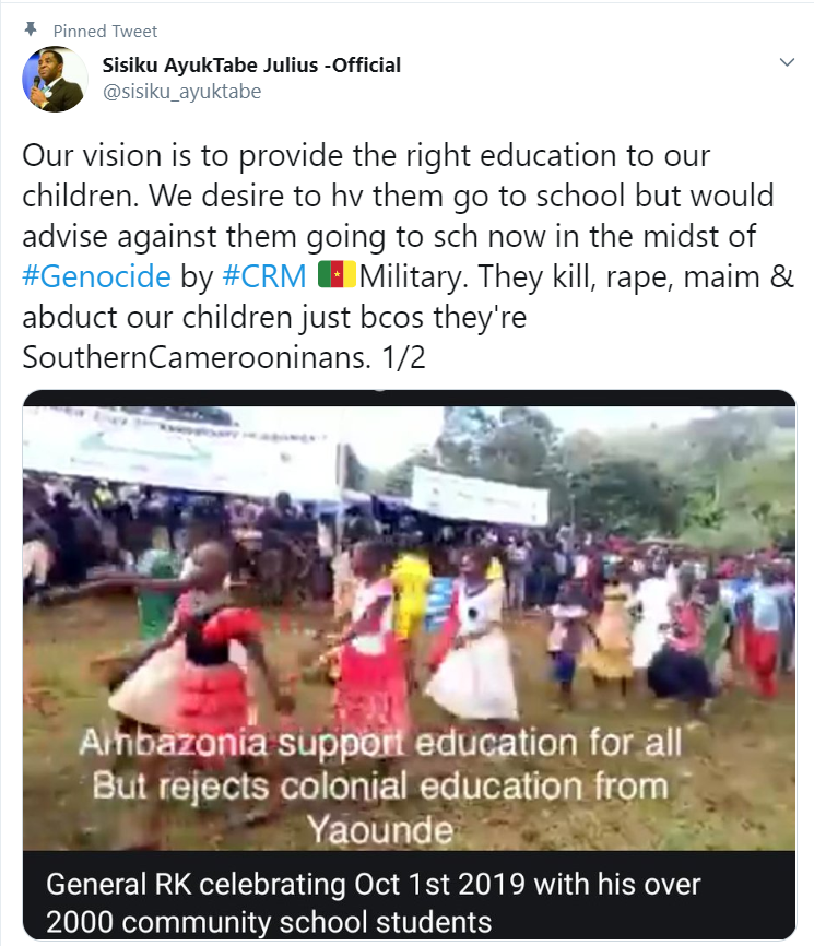 “Our vision is to provide the right education to our children. We desire to have them go to school but would advise against them going to school now in the midst of #Genocide by #CRM Military. They kill, rape, maim & abduct our children just bcos they’re SouthernCamerooninans. Ambazonians cherish educating their children. However, the Right to #Life precedes the Right to #Education. When peace returns, our children will go to school & each of them will have a world-class education, which will offset the sacrifices they are making now. #No2Genocide.”