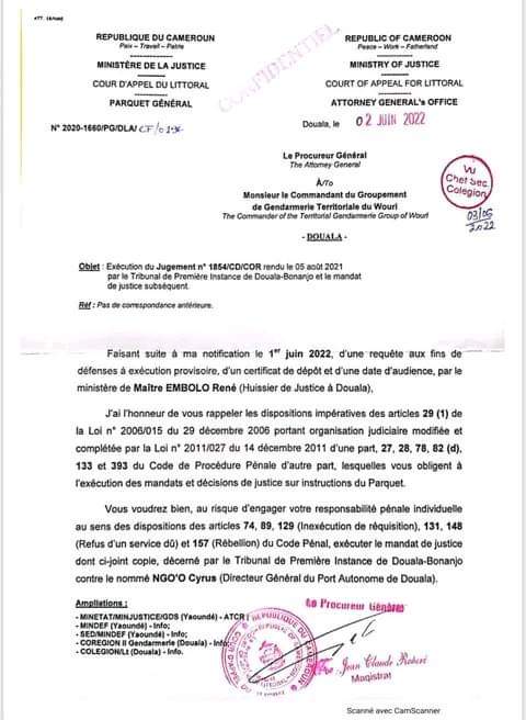 He ends by reinstructing the Wouri territorial gendarmerie group commander to arrest the Director General of the Douala Port Authority Cyrus Ngo’o so he can face the law at the Bonanjo court.