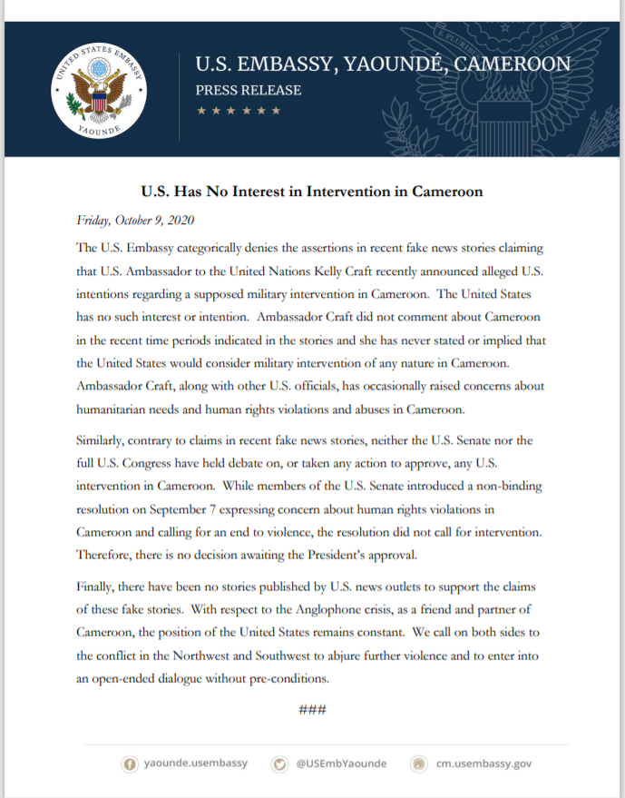 The US Embassy In Yaoundé, Cameroon has described as ‘Fake News’, circulating on social media, alleging that the US Ambassador to the United Nations, Kelly Craft, has said the United States will send military to intervene in Cameroons northwest and southwest regions. An audio, seem to be a newscast but the media organ is not mentioned with a man speaking French, is being circulated. In the audio, it is alleged that the US will intervene to end violence in the Anglophone region in favour of Ambazonians seeking to create a State.