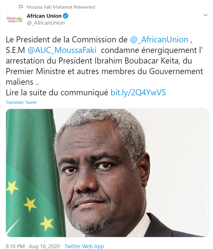 The President of the African Union Commission Moussa Faki Mahamat strongly condemns the arrest of President Ibrahim, Boubacar Keita, the Prime Minister and other members of the Malian Government and calls for their immediate release.