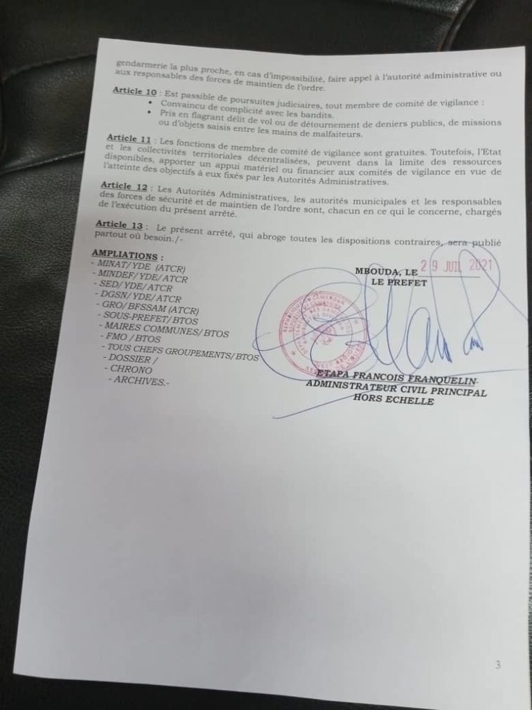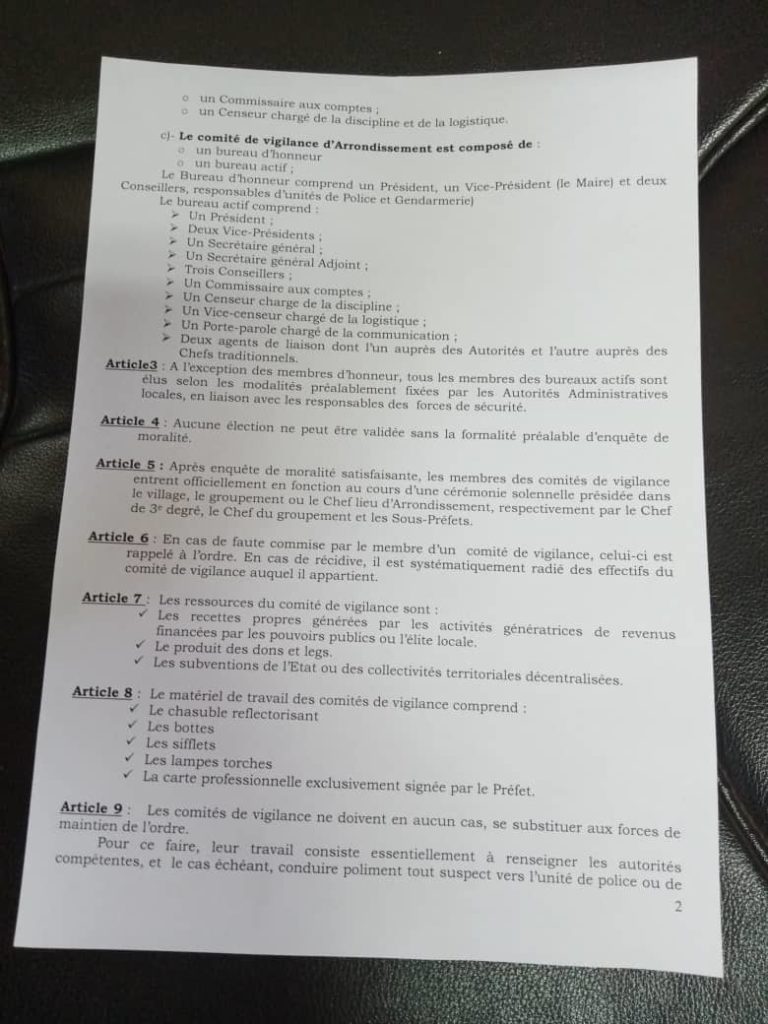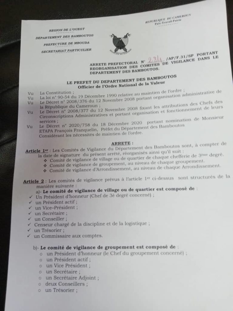 According to the decision, 1st, 2nd and 3rd class villages, all 4 subdivisions of the Bamboutos will constitute headquarters of the vigilante committees. Each committee will be made up of a bureau with well-defined posts of a president, vice president, secretary, treasurer, counselors, financial secretary, discipline master, etc.