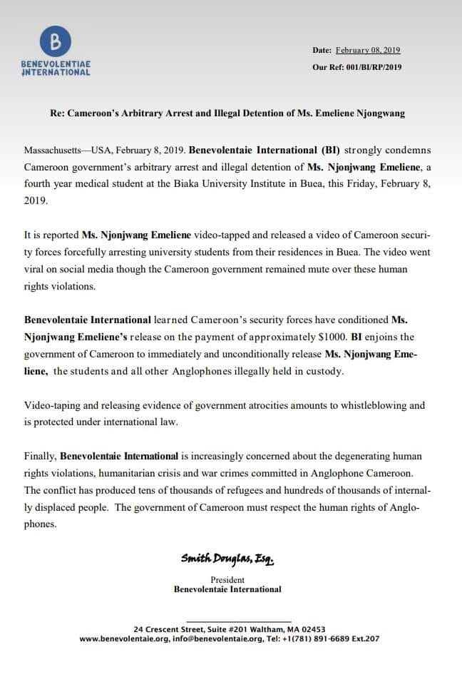 Buea- Cameroon-Saturday February 9, 2019-4 pm Local Time(Cameroon News Agency) Two international human rights Non Governmental Organizations, Benevolentaire International, BI and Center for Human Rights and Democracy in Africa, CHRDA, have demanded the unconditional release of a 4th year nursing student of the Biaka Institute in Buea, Njingwan Emeline, arrested by Police last Wednesday February 6, 2019 for allegedly video-taping scene of massive arrest around the Molyko Police station, South West region.