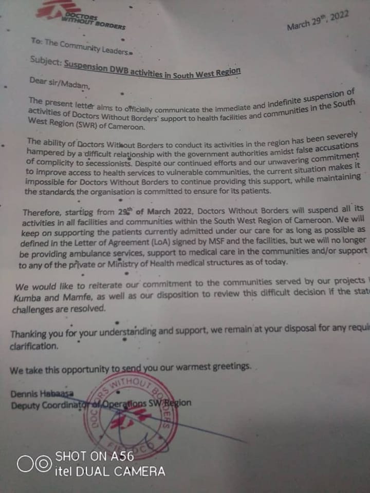 After months of witch-hunting, administrative suspension in the Northwest region, arrest, and detention of their employees in December, Doctors Without Borders has decided to suspend its activities in the South West region. The International NGO that has been helping war victims leaves a huge void as the conflict persists.