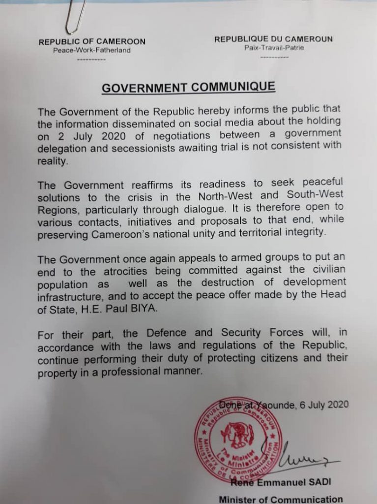 A statement signed by Communication Minister, Rene Sadi on Monday July 6, 2020 , said the government is opened to various contacts and willing to seek a peaceful solution to the conflict rocking the two Anglophone regions but must maintain the territorial integrity.