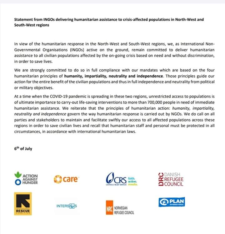A group of international Non-Governmental Organisations, NGO, have appealed on Separatists and Government forces in the northwest and southwest regions to relax their grip on major areas, so as to ease humanitarian access to more than 700, 000 people in dire need.