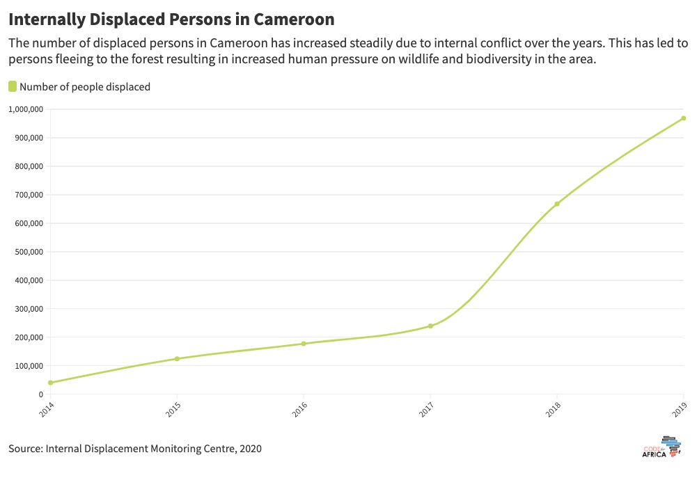 The Environment and Rural Development Foundation (ERuDeF), a conservation non-profit in Cameroon, reports that the fighting has sent more than 90% of the population of Lebialem division in the South West region fleeing into forests, resulting in increased human pressure on wildlife and biodiversity in the area. The effect of this mass displacement, ERuDeF states, has been the large-scale conversion of animal habitats into makeshift human settlements and the poaching of protected wildlife species for food.
