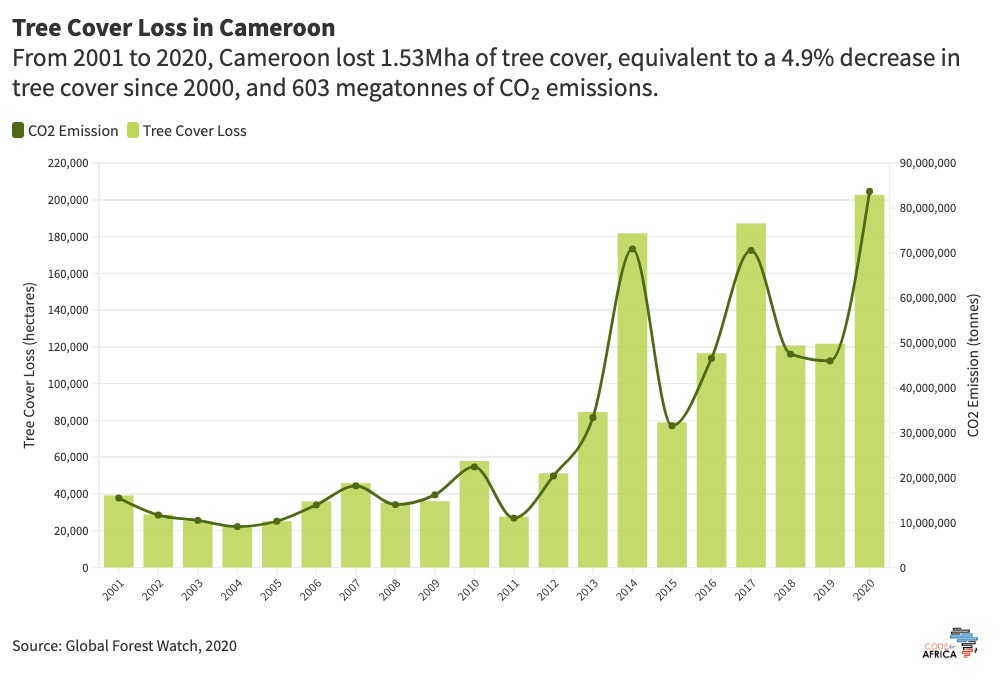 According to the international conservation group Global Forest Watch, in 2020 Cameroon lost 201kha of natural forest, equivalent to 83.0Mt of CO₂ emissions. The organization further reports that from 2001 to 2020, Cameroon lost 1.53Mha of tree cover, equivalent to a 4.9% decrease in tree cover since 2000, and 603Mt of CO₂ emissions.