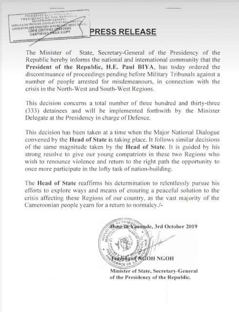 Paul Biya wrote on his Facebook page, “I have ordered the discontinuance of proceedings pending before Military Tribunals against 333 persons arrested for misdemeanours, in connection with the crisis in the North-West and South-West Regions.”