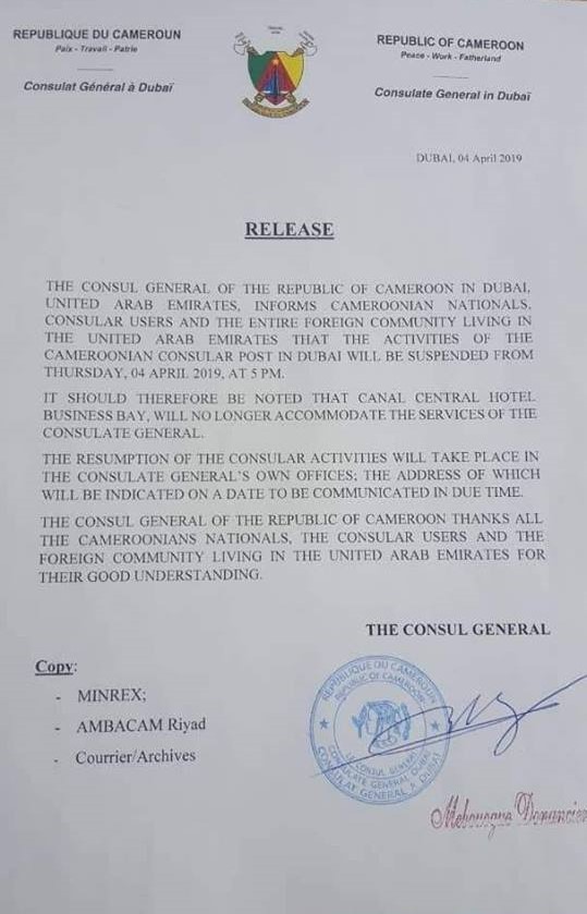 In a Communique, dated April 4, 2019, H.E Donancier Mebouogue, General Consul of Cameroon in Dubai-United Arab Emirates, said the suspension is aimed at getting a permanent office for its activities that are still to be official.