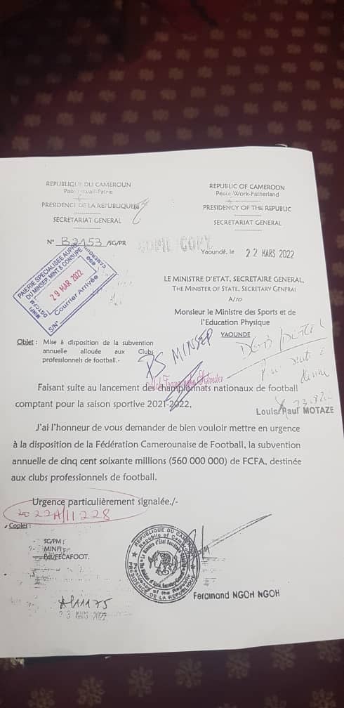 The sports ministry in a note written by the special treasurer at the ministry and addressed to the finance ministry has shown that the amount was given to the FECAFOOT accountant in two installments between April 18th and 27th 2022.