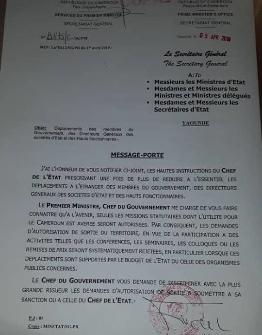 On April 5, 2019, the Prime Minister of Cameroon through the Secretary General, Seraphin Magloire Fouda, recommended a discriminatory approach forwards granting travel requests from State institutions to Ministries.