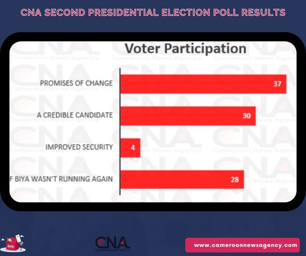 Voter Participation: What would motivate you to vote on October 12? Going by the results of this variable, Cameroonians just want change, out of 1045, 390 ( 37%) said they will vote if there will be a change in leadership: Some 318 (30.43) said they will only vote if there is a credible candidate. 290 (27.75) people said they will only vote if Paul Biya wasn’t running again, while 47 people (4.5%) said if there is improved security on the ground.