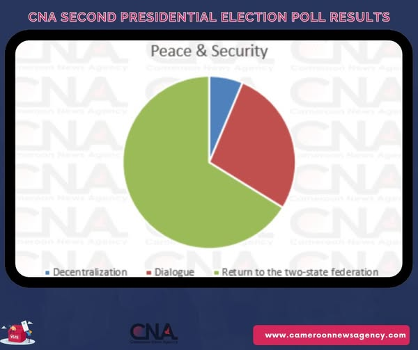 Peace & Security: How should the next president approach peace in the Northwest and Southwest regions — dialogue, decentralization, or a return to the two-state federation? Majority of respondents, 692 (66.22%) out of 1045, say the new president of Cameroon should take the country back to two state-federation. Meanwhile 287 (27.46) think that only dialogue will end the conflict and bring peace in the NWSW regions. 66 people (6.22%) said decentralization is the only option for peace to return.