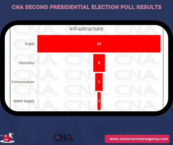 Infrastructure: What is the single most urgent infrastructure project you expect the next president to prioritize? An overwhelming 84% of respondents want the next president to prioritize road construction, showing how critical transportation remains across Cameroon. Only small portions highlight electricity (8%), communication networks (5%), and water supply (2%), suggesting that poor road infrastructure is perceived as the main barrier to development.