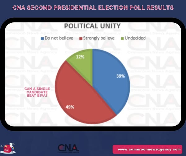 The chart shows nearly half (49%) of respondents confident that a single opposition could defeat President Biya, while about 39% doubt it. Roughly 13% remain undecided. This suggests a divided but hopeful electorate, where unity among opposition parties could be a key factor influencing voter turnout and expectations. Previously 75% said the main opposition leader is Issa Tchiroma Babary. Going by this, 49% of respondents think that the main opposition leader could likely beat incumbent Paul Biya.