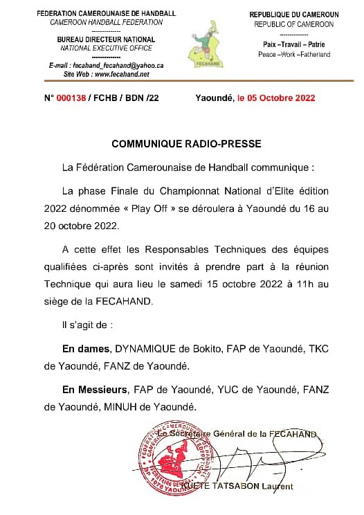 The final phase of the National Elite Championship dubbed “Playoffs” takes place from October 16th to October 20th in Yaounde as announced by the Cameroon Handball Federation in a release.