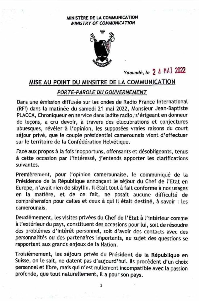 In a programme aired on Radio France Internationale (RFI) on May 21, Jean – Baptiste Placcard, an editor, said that Biya had traveled for personal reasons leaving behind a cryptic message Cameroonians could not understand and had made allusions to the idea that the hostility of Cameroonians in Switzerland made it impossible for him to stay longer as he had previously been known for doing.