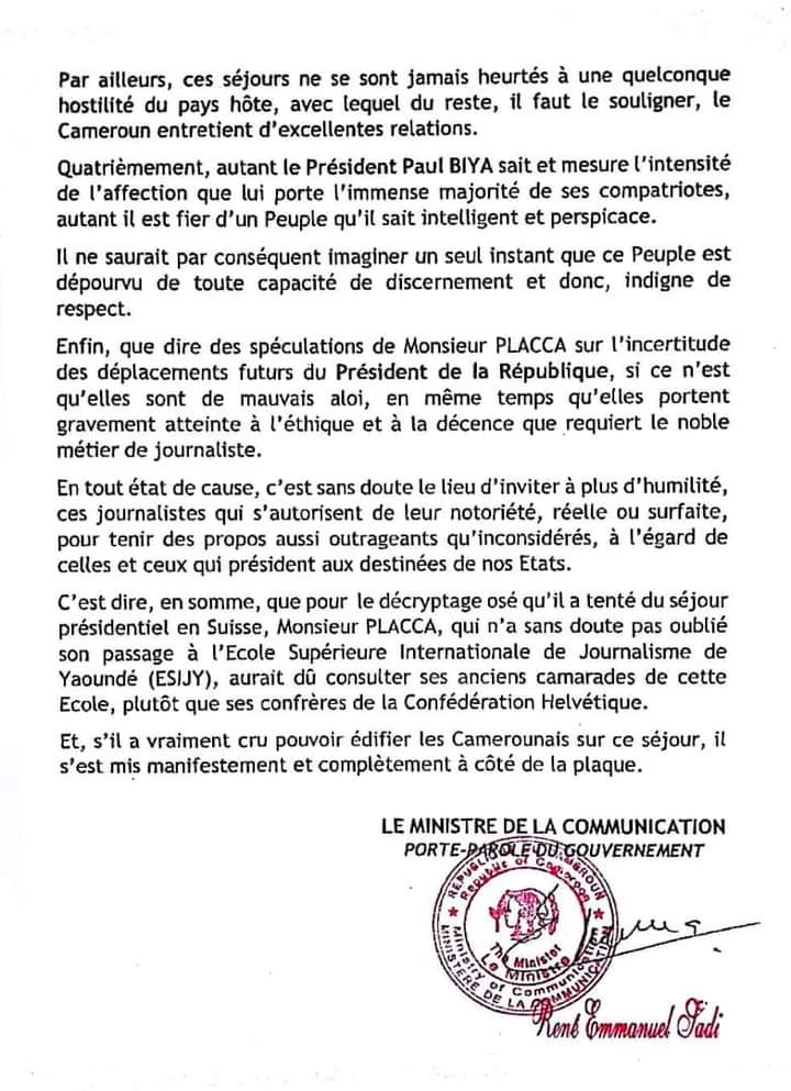 The communication boss concludes by saying that the allegations made by Placcard are preposterous and disrespectful to the state because they are untrue. He also reminds the journalist of his training at the present day Advanced School of Mass Communication of the university of Yaounde 1 underlining he should have liaised with his colleagues in Cameroon and not those in Switzerland to know more about the President’s trip.
