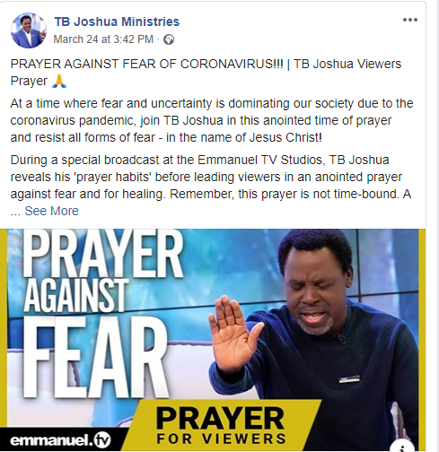 Amid all these hopes, popular Nigerian Prophet, T.B. Joshua prophesied that the virus will end on Friday March 27, 2020.