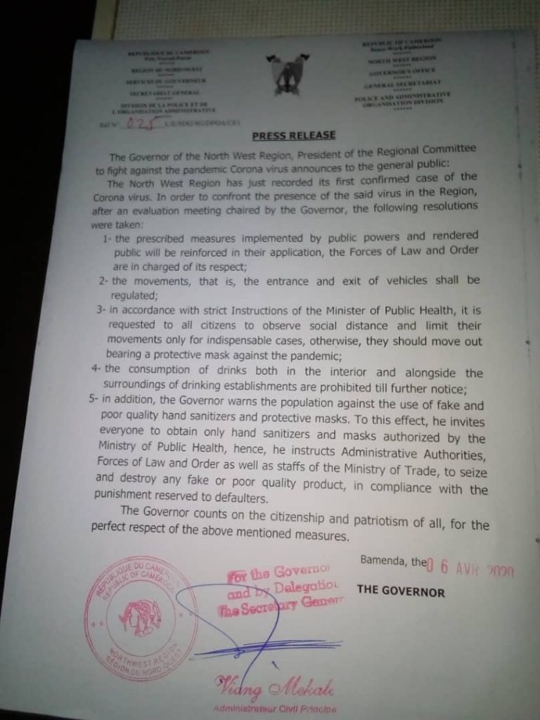 The Northwest region has been added in the list of regions with COVID-19 positive cases, the governor of the region, Adolphe Lele L’ Afrique has confirmed this in a statement on Monday April 6, 2020. As the alert bell rings, the administrator has banned the consumption of drinks in the interior and alongside liquor spots.