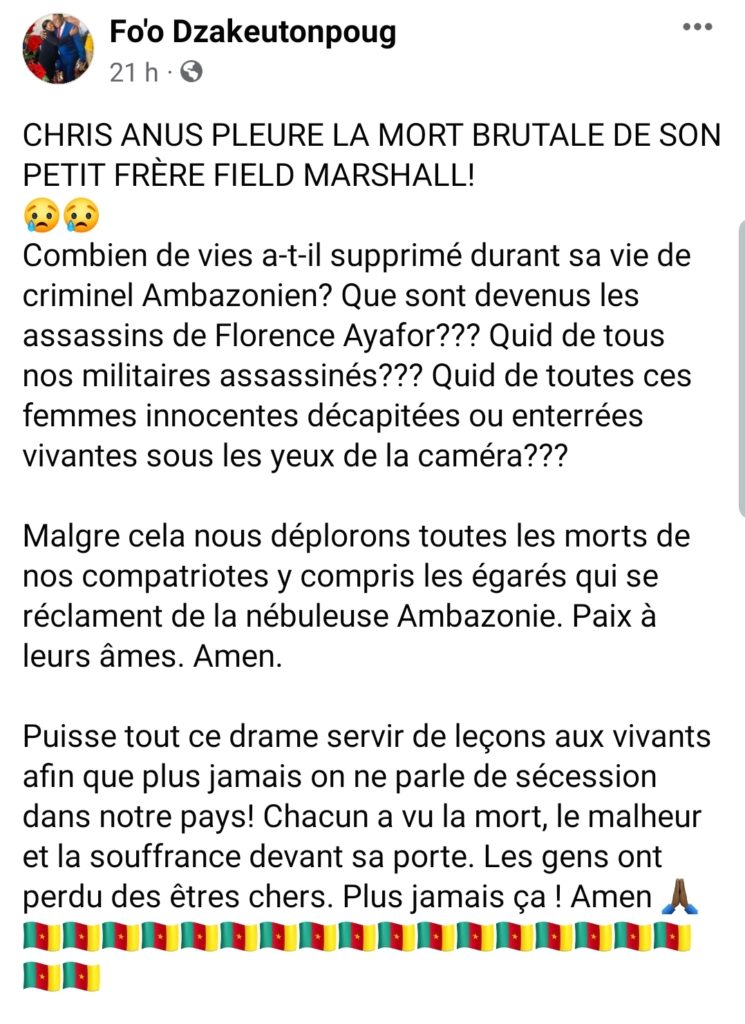 The Minister Delegate at the Ministry of Justice, Jean de Dieu Momo wrote on his Facebook account that every fighter in Anglophone regions must understand that the death of Oliver Lekeaka alias Field Marshal means they too can be taken out.