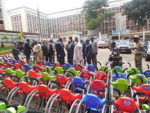 These wheelchairs are allocated for the Ministry of Social Affairs, the Chantal Biya Foundation, two General hospitals, one regional hospital, Laquintinie hospital in Douala and four District hospitals.