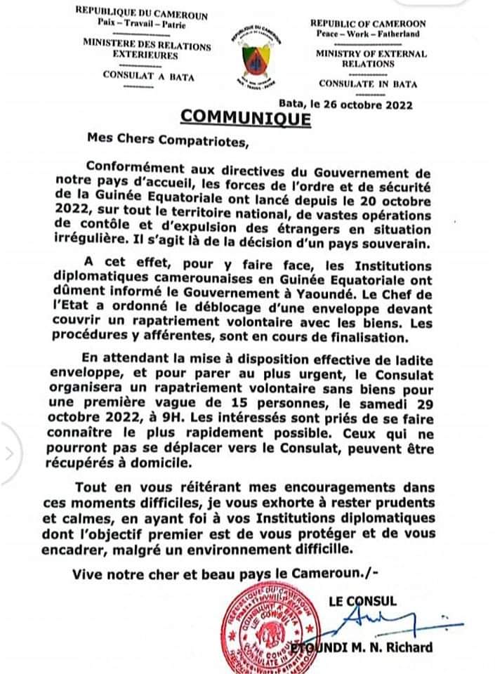 In a communique made public on 26 October 2022, the Consul General, Etoundi M. N. Richard said the vast operation of control and expulsion of foreigners who are living in the country illegally, launched since October 20 is an irrevocable decision of a sovereign nation.