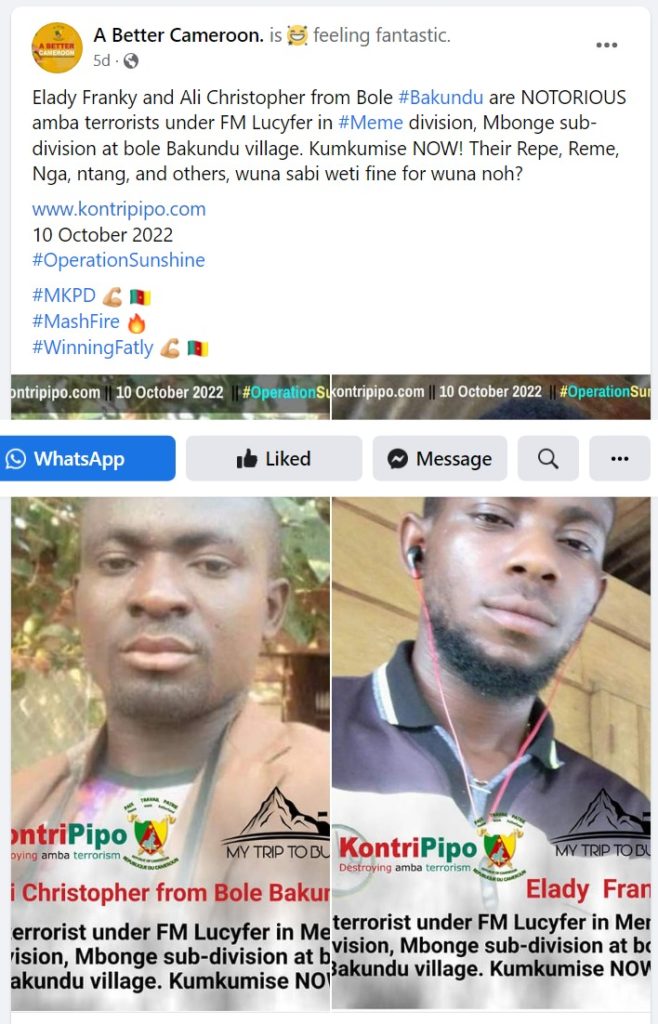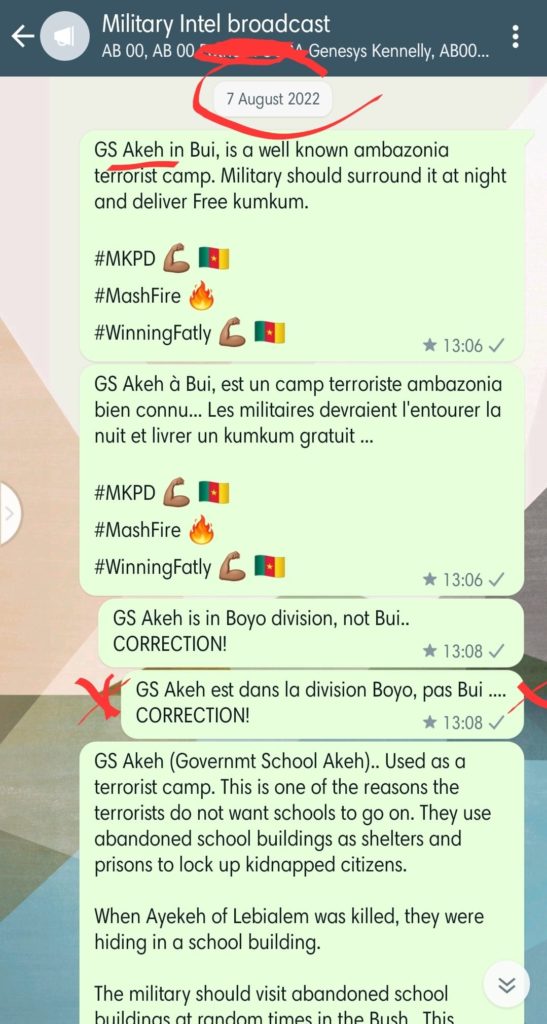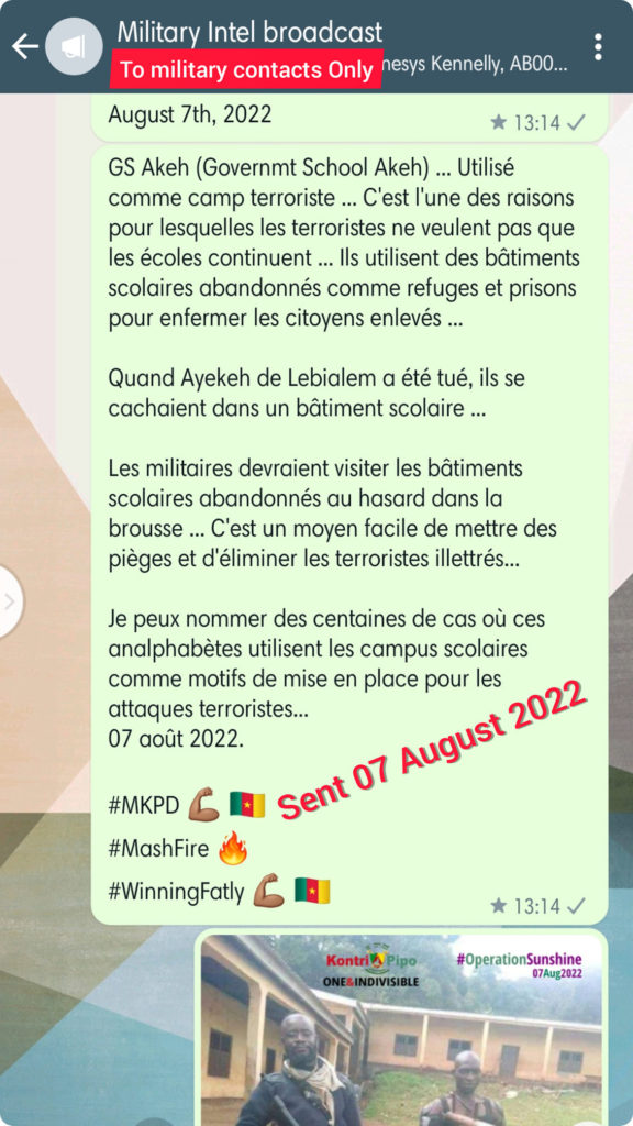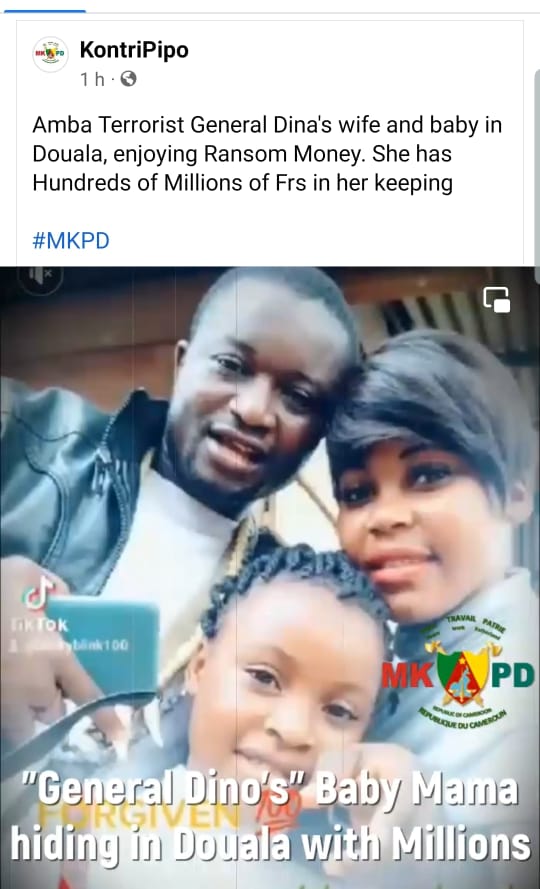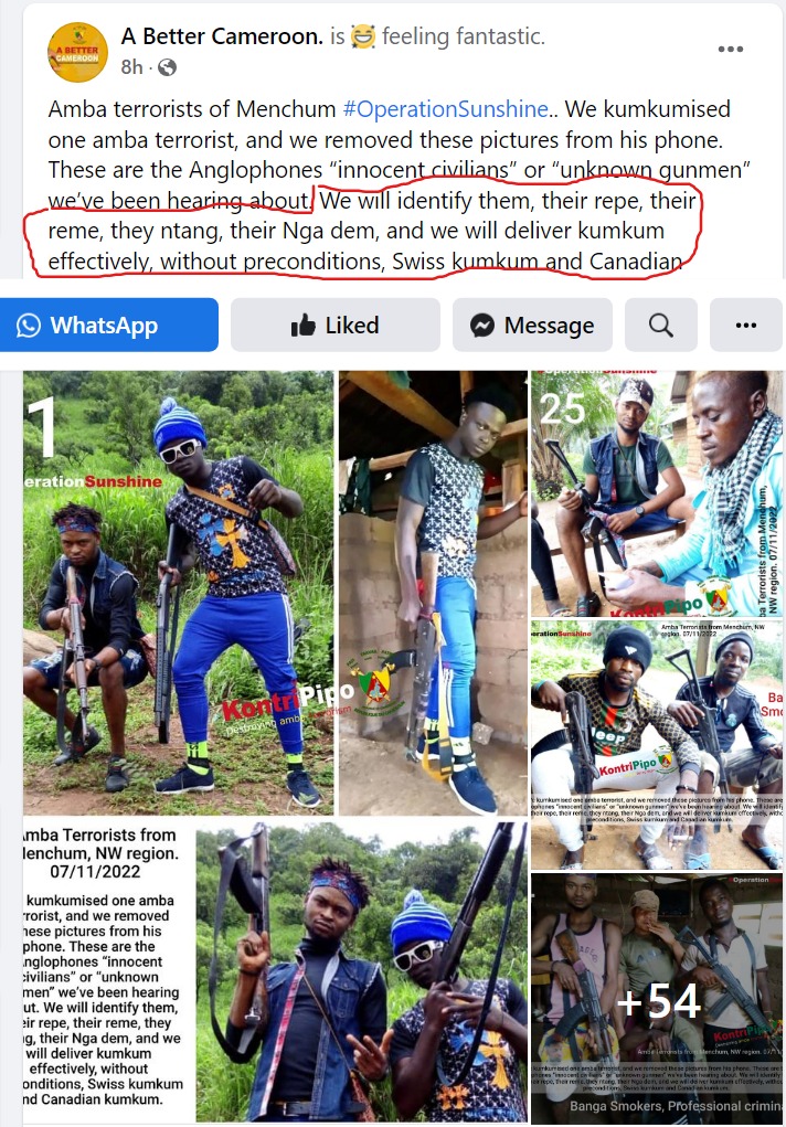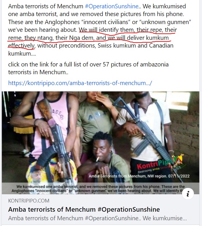 The British Navy, Nkonda Titus is intentionally targeting civilians in the Anglophone regions when he writes in his numerous pages that, “We need to Kumkum their reme, repe, pikin dem”, a symbolism for killing, meaning the relatives of separatists should be targeted “deliver kumkum” meaning killed. This jargon is used to bypass Facebook Algorithm.