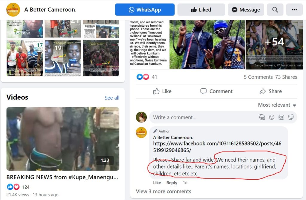 Several such cases including giving information to security forces to investigate civilians have ended up in forced disappearance or wrong target. The repercussion has been enormous. A piece of evidence that he talks directly with the Cameroon military can be seen in several screenshots shared on his page.
