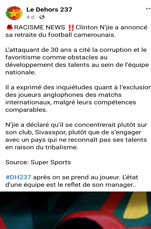 Clinton Njie is a Cameroonian Footballer who plays for the Cameroon National football team, The Indomitable Lions. On the eve of the AFCON2023 last group C qualification match between Cameroon and Gambia, information about Njie’s resignation from the national football team of Cameroon circulated on Facebook and WhatsApp. Specifically, the page named “Le Dehors 237”, with about 10k followers published an article that said that Clinton Njie announced his resignation from the Cameroon national football team, citing Super Sports as source.