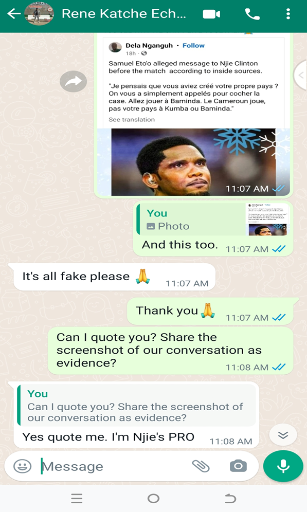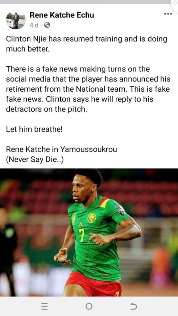 To further check the veracity of the claim surrounding Clinton Njie’s resignation, we got into contact with Njie’s PRO, René Katche, who said that the claim is fake. Furthermore, it was also said that Njie was approached and insulted by the President of the Cameroon Football Federation, Samuel Eto’o, who allegedly said Njie should go and olay in Bamenda. This too is fake!