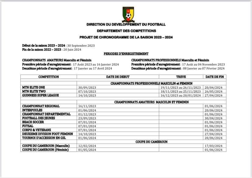 Activities of the 2023-2024 football season have been unveiled by FECAFOOT in an agenda made public by the institution’s competition department indicating that the new season begins on September 30, 2023 and ends on June 20, 2024.