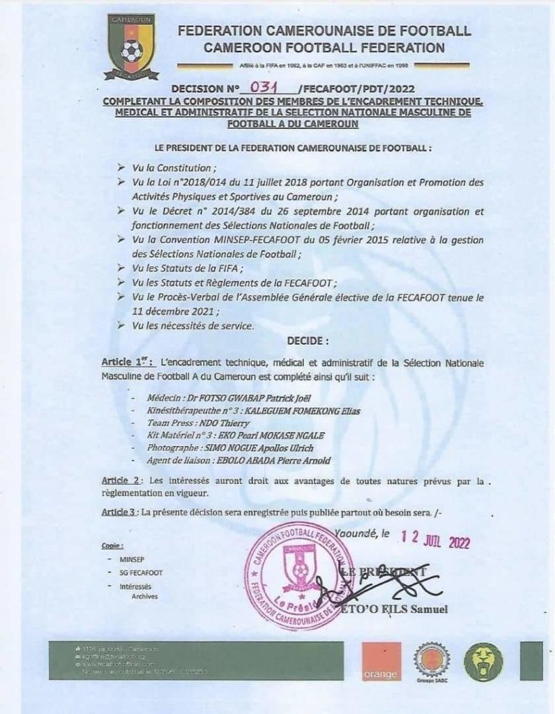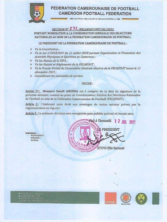 He replaces his former team mate, Bill Tchato who was appointed to the position by the former President of the Cameroon Football Federation, in 2019.