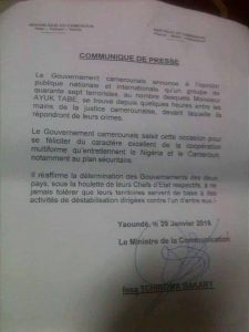 Yaounde, Cameroon-Monday January 29, 2018-7:37 PM Local Time (Cameroon News Agency) Communication Minister Issa Tchiroma Bakary has confirmed that Ambzonia leader Sisiku Ayuktabe Julius and others arrested in Nigeria were extradited to Cameroon and are under custody, National Broadcaster has reported.