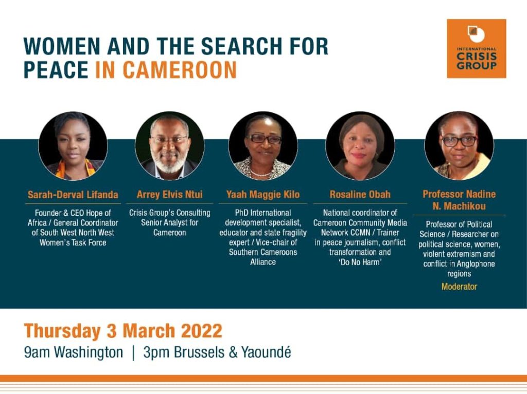 Rosaline Obah, the National Coordinator of the Cameroon Community Media Network (CCMN) who is also Regional Coordinator of the network for the North West, has come under serious government threats for exposing the regime’s lapses in handling the Anglophone crisis during a webinar meeting with the International Crisis Group (ICG) on March 3, 2022. The webinar meeting was discussing the role and challenges of women and the search for peace in Cameroon.