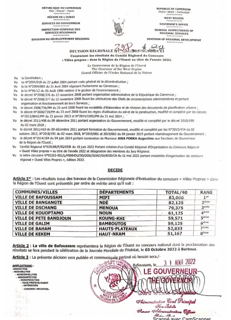 The city of Bafoussam will represent the West region at the National Cleanliness Contest that will take place in Bertoua on October 3rd 2022. The city has been declared the cleanest town of the region by the regional commission of the clean city contest for the West. The commission headed by Governor Awa Fonka Augustine made known the result on August 31st, 2022.