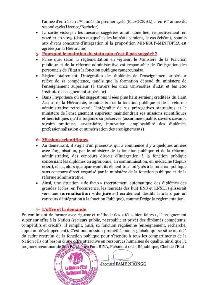 Minister Jacques Fame Ndongo ends by emphasizing that it is a process which started years ago with the organization by MINFOPRA of integration exams in the sectors of medicine, communication and agronomy to name but these and is simply being extended to the teaching sector.
