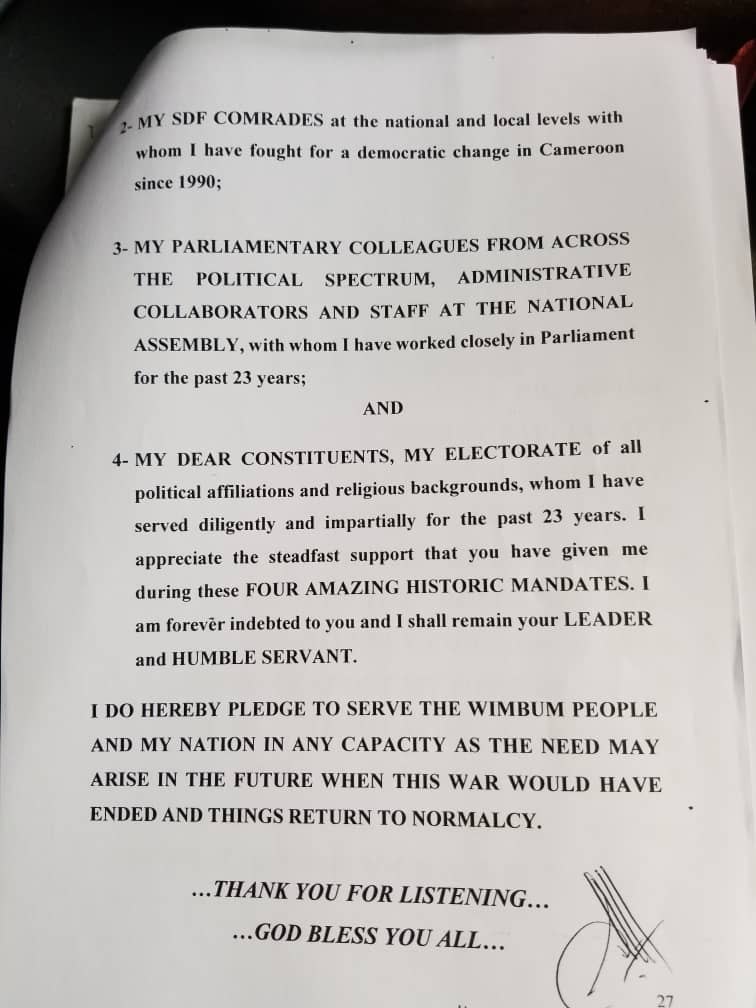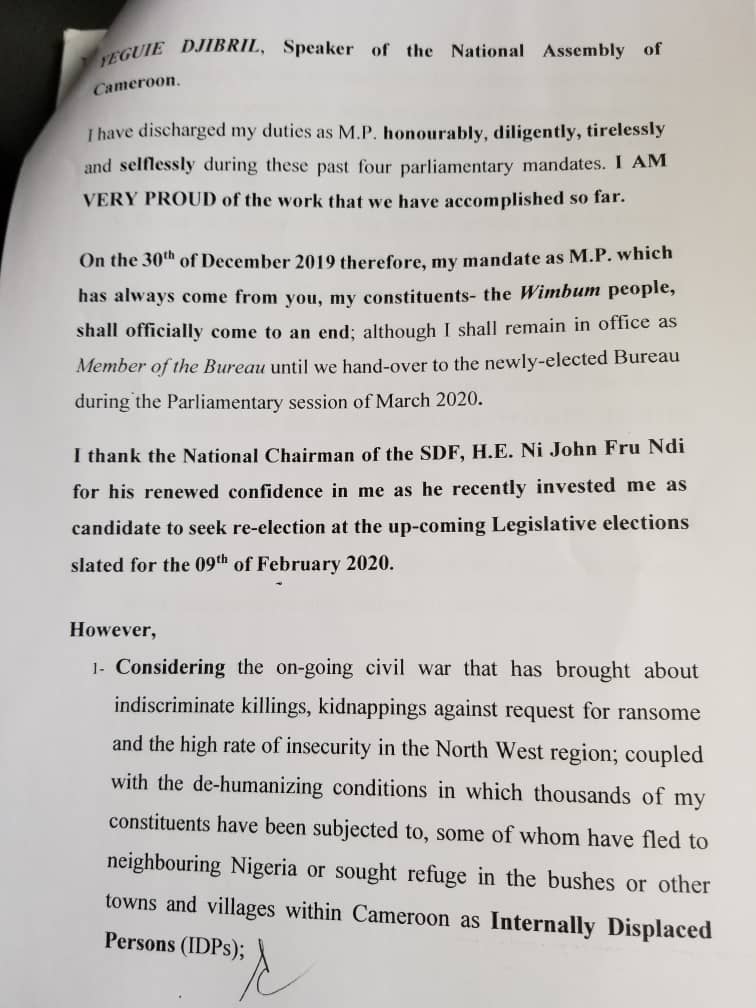 He made the announcement at the Parliamentarian Hotel in Yaounde on Tuesday, November 19, 2019.
