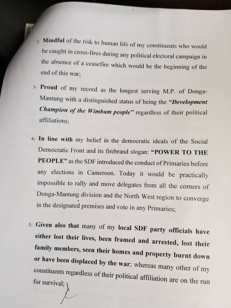 The Social Democratic Front, firebrand Member of Parliament for Donga Mantung Central Constituency which comprises Ndu and Nkambe, Hon. Mbaya Awudu, has said he will not seek another term in office and will respectfully withdraw on December 31, when their present mandate ends. The man who has been MP for four mandates has said the so-called Special Status is empty, therefore he cannot be part of an election which will be at the detriment of the local population.