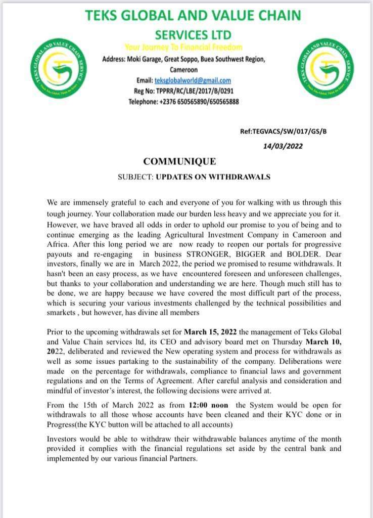 According to some of the company’s communication to investors, which CNA obtained, there has never been a financial problem with Teks Global. On March 14, 2022, just one day to payday, the company released a statement thanking investors for their patience. The release also noted that the board has a meeting on March 10, 2022, and decided to open a progressive withdrawal system, “From 15th of March 2022 as from 12:00 noon the system would be open for the withdrawals to all those whose accounts have been cleaned and their KYC done or in the progressive. Investors would be able to withdraw their withdrawable balances any time of the month provided it complies with financial regulations set aside by the central bank and implemented by our various financial partners,” part of the statement read.